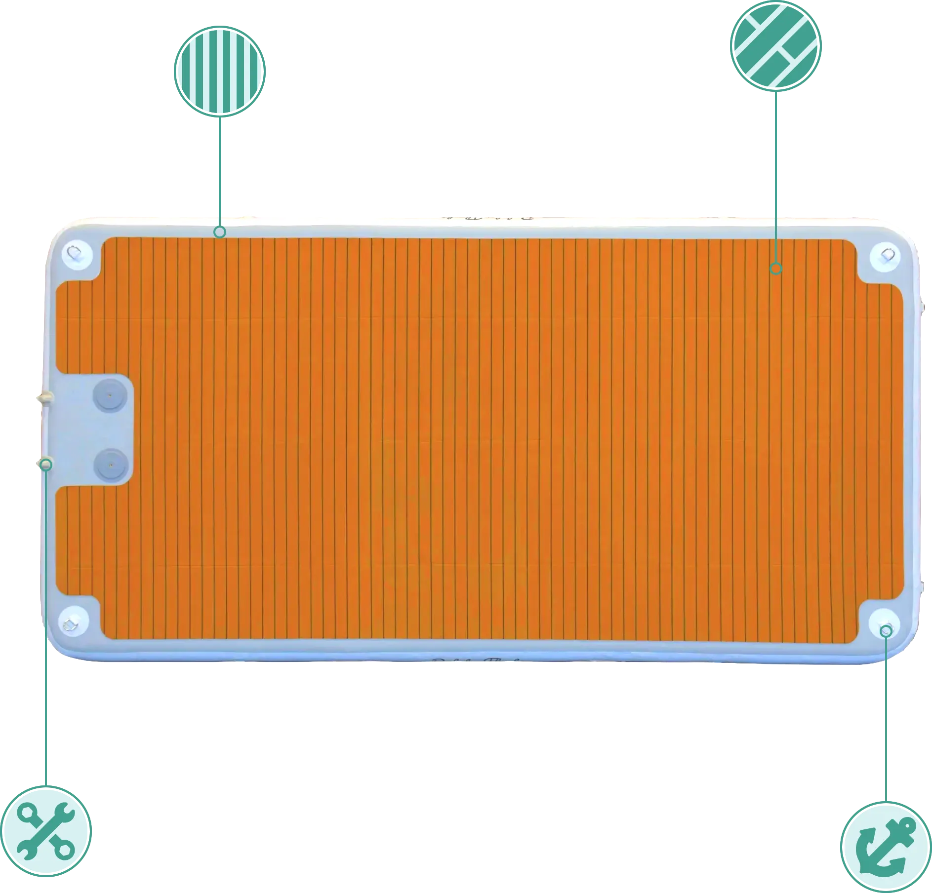 Die elegante EVA-Teak-Oberfläche verleiht deinem yourFLOAT nicht nur den Look eines echten Yachthafens, sie ist auch rutschfest, angenehm weich und bleibt selbst bei Sonne, Salzwasser oder Regen zuverlässig in Form. Ob zum Sonnenbaden, als Lounge-Bereich oder für die Kinder zum Spielen – hier wird jeder Moment zu einem besonderen Erlebnis.